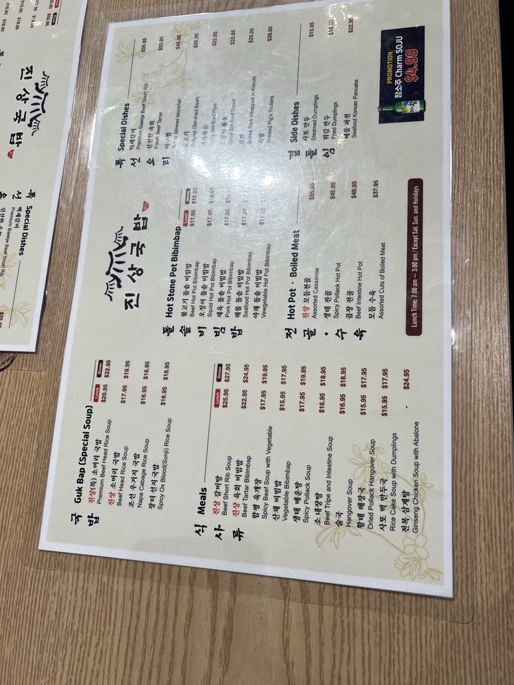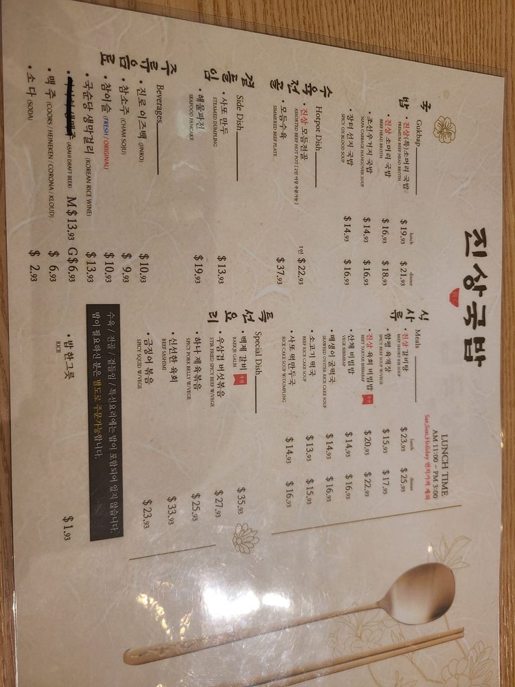 Introducing the menu at Jinsang Gukbap in Queens, NY, a Korean restaurant known for its traditional soup dishes. The beef head soup stands out as their signature item, with options like premium beef head broth, ox blood hangover soup, and napa cabbage hangover soup. Other meal choices include beef short rib soup, beef tartar bibimbap, and vege bibimbap. Sides like steamed dumplings and seafood pancake are also available. Customers praise the delicious beef head soup and beef tartare bibimbap, along with the complimentary banchan side dishes. While some mention slight seasoning concerns, overall, Jinsang Gukbap is a go-to spot for Korean comfort food. With a variety of flavorful and fulfilling dishes, this restaurant caters to those craving hearty Korean cuisine.